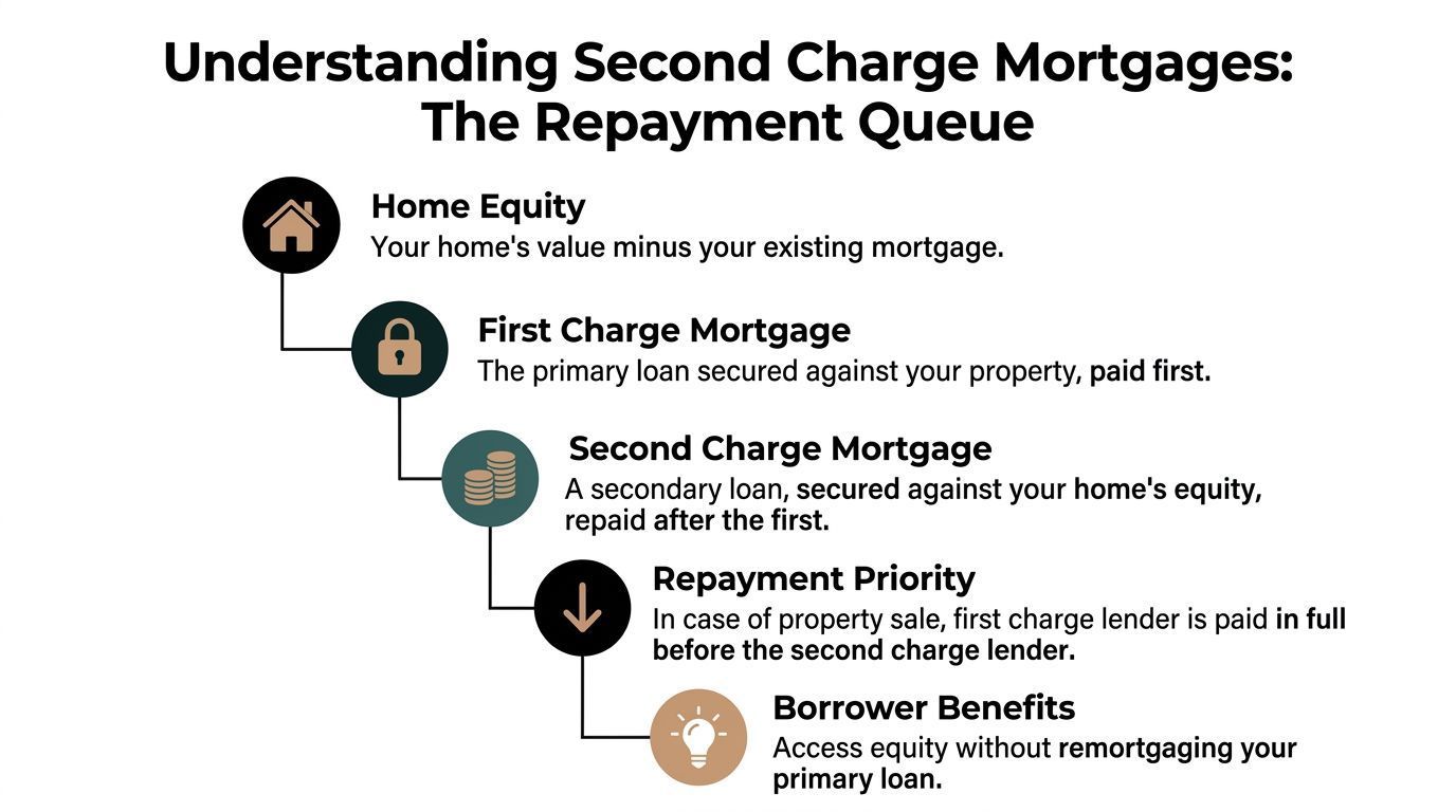 That legal priority is why second charge lending is priced differently. A second charge mortgage is a secured loan against the equity in a property that already has a first charge mortgage, and the second lender ranks behind the first in repayment priority. Lenders typically advance 60-85% LTV on the available equity, while total borrowing across first and second charges rarely exceeds 75-85% combined LTV. That subordinate position also means higher interest rates, with the cited guide noting pricing typically 4-8% above first charges, for example 7-12% APR versus 4-6% base rates in 2023-2025 UK data.